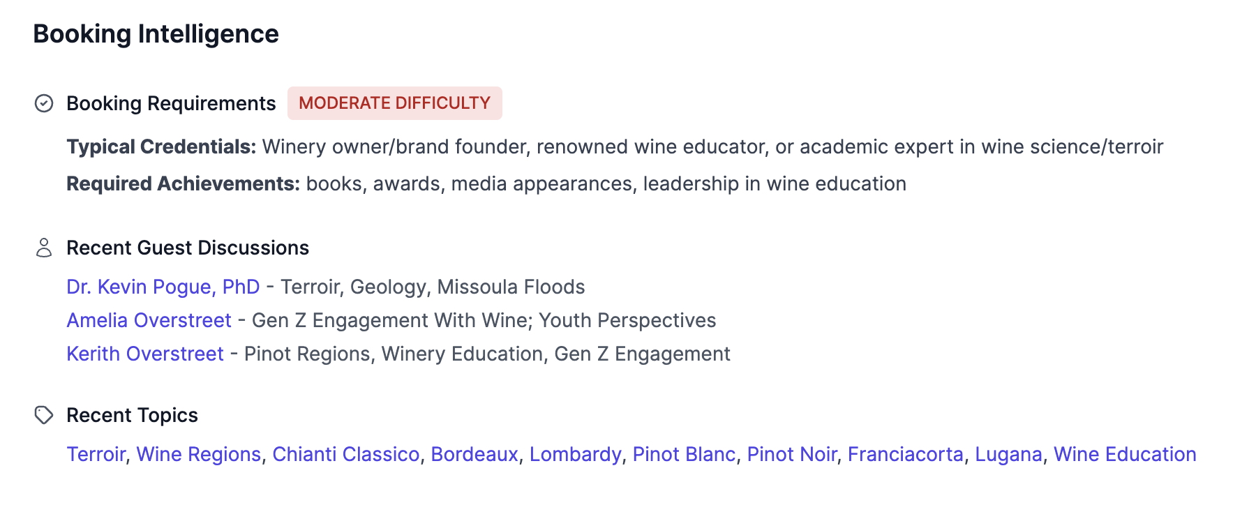See booking requirements, recent guests, and key topics upfront — so you know which shows are worth pitching before you waste time.